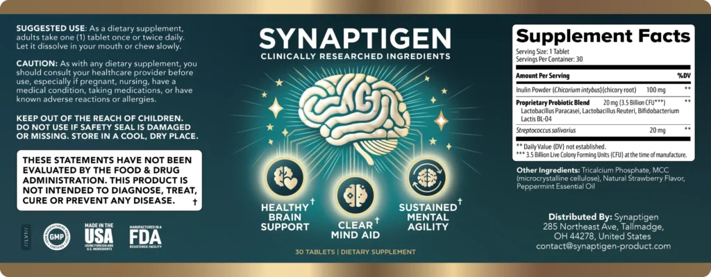 Synaptigen is a natural supplement designed to enhance optimal brain performance, protect cognitive functions, and support mental health at every stage of life. Its advanced formula combines probiotics, nutrients, and natural extracts that work synergistically to improve memory, concentration, and emotional balance while protecting the brain from premature aging.